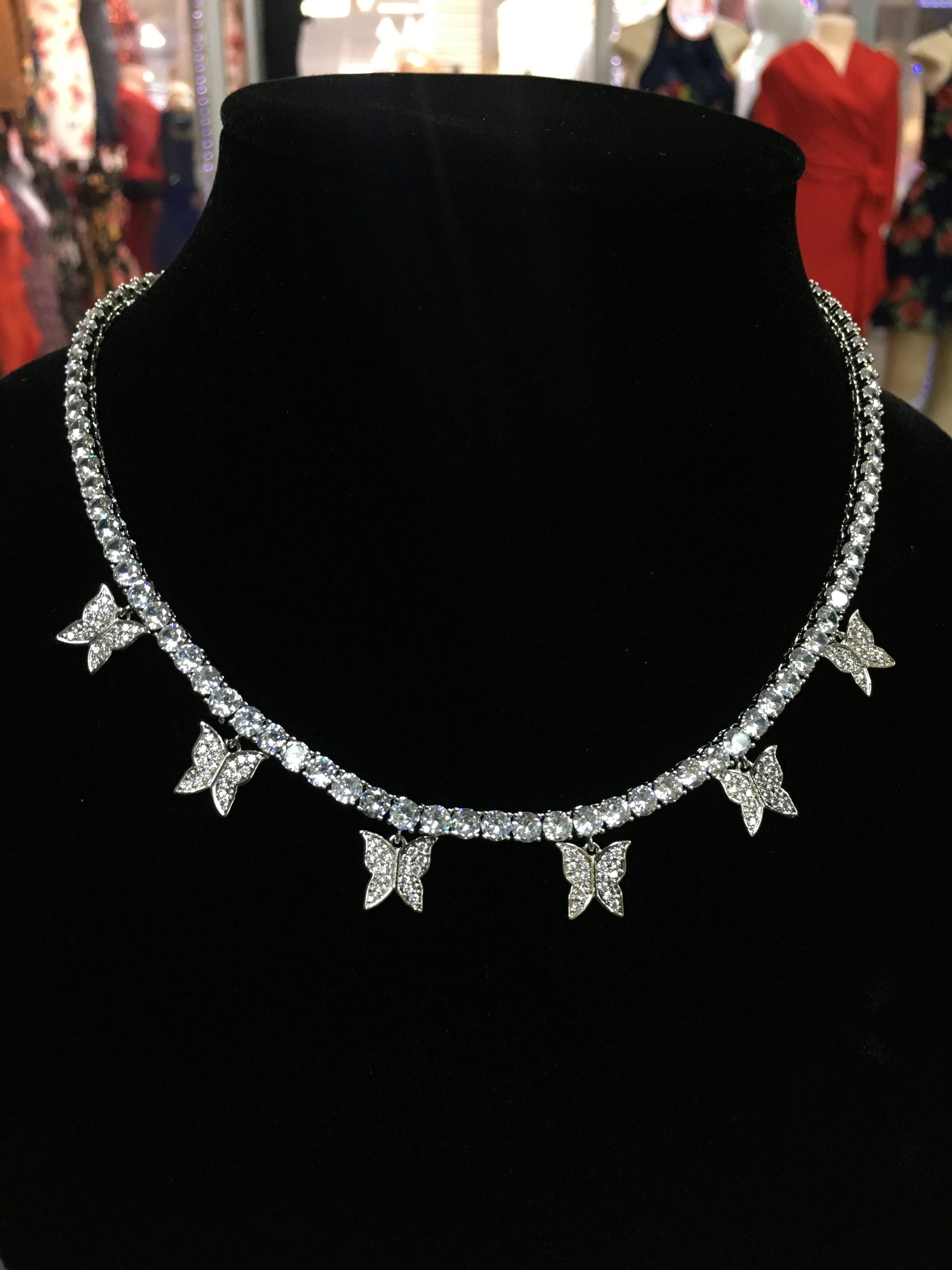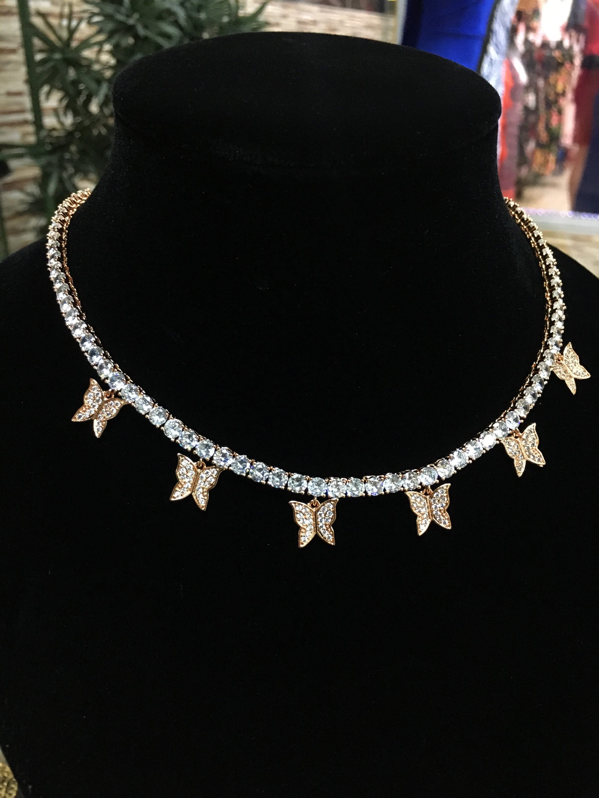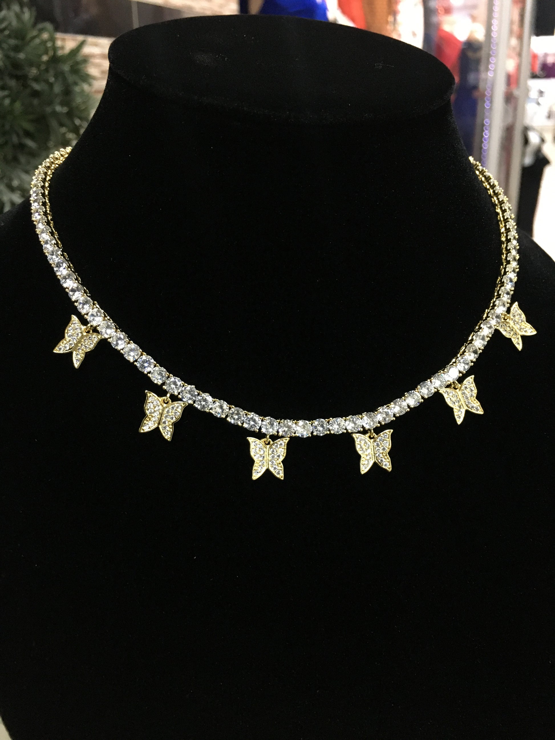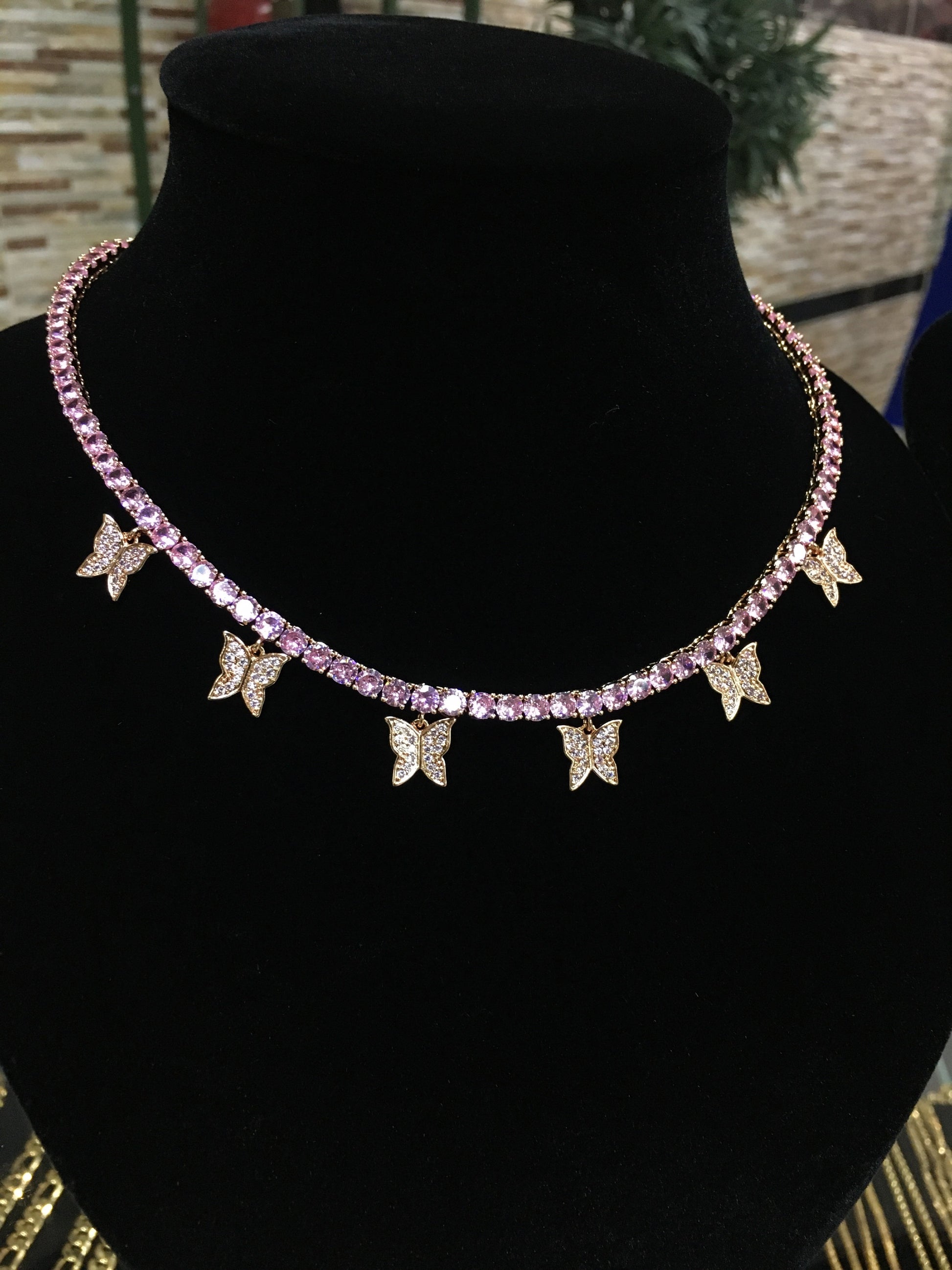 Available in Gold, Rose Gold, Pink and Silver. Features a Tennis Chain with butterfly pendant design.